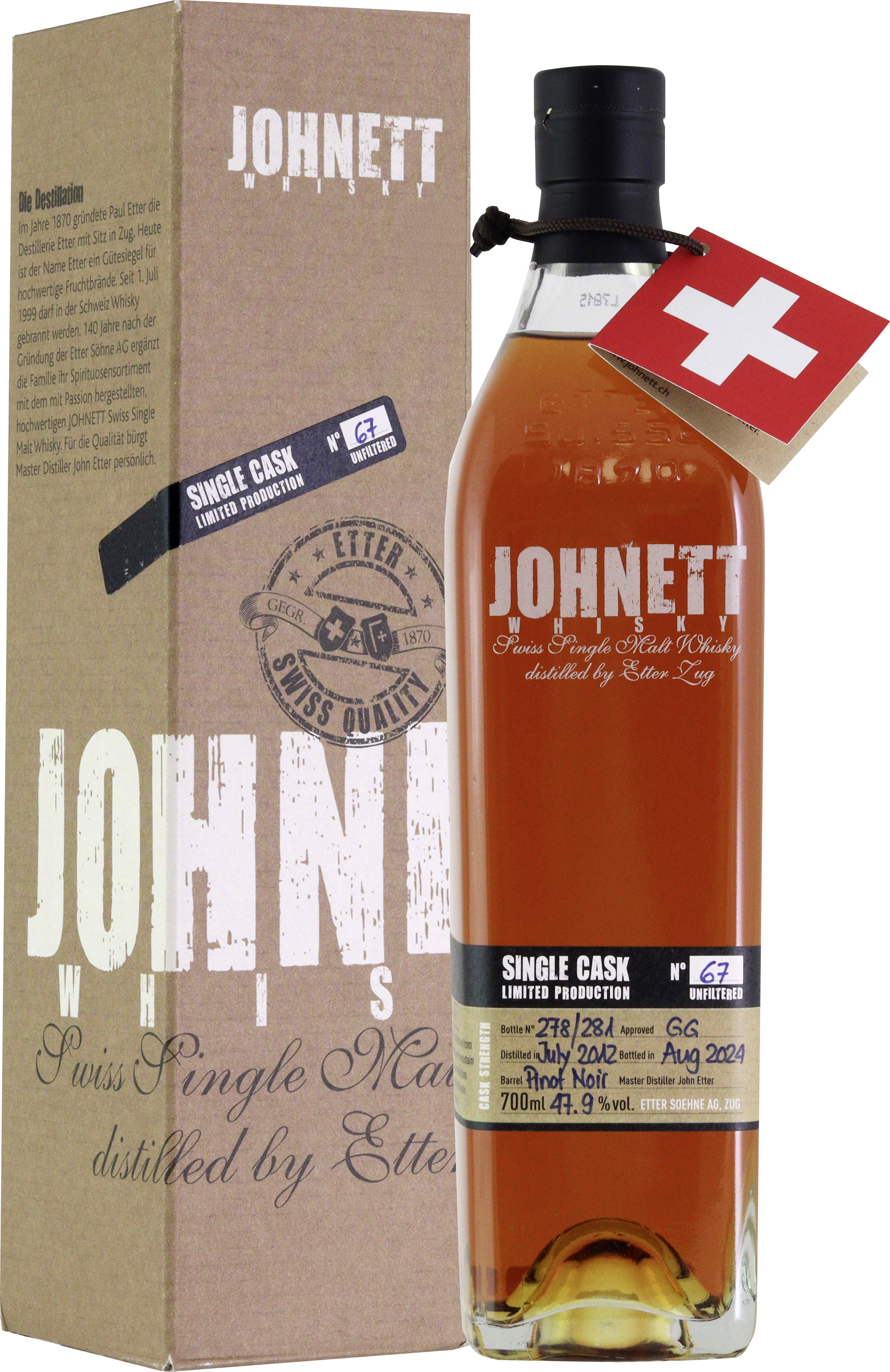 JOHNETT Swiss Single Malt Whisky -eine regionale und ausgefeilte Köstlichkeit Die Heimat von JOHNETT liegt im malerischen Zugerland mitten im Herzen der Schweiz. JOHNETT baut gänzlich auf regionale Ressourcen. Heimische Maische aus Gerstenmalz, vorbereitet von der Brauerei Baar, die Destillation im Hause Etter, Quellwasser aus den nahe gelegenen Höllgrotten in Baar und Eichenfässer des Qualitätsweinguts Rosenau bei Luzern spielen zusammen. Diese Köstlichkeit vereint Regionalität, Authentizität und Hochwertigkeit zu einem stimmigen Ganzen. Nur eine Handvoll selektierter Fässer im Jahr werden als Single Casks abgefüllt. Nur wenn das Destillat im Fass ein Mitglied der Etter Familie außergewöhnlich begeistert, wird entschieden, dieses unverschnitten als exquisites Beispiel der JOHNETT Qualität in den Focus zu stellen. Das Fass 67 hat Gabriel Galliker-Etter gemeinsam mit Andrea Caminneci ausgesucht, der im Hause Schlumberger/Segnitz, als "Keeper of the Quaich" nicht nur als Experte für schottischen Whisky tätig ist. Auf ein 12 Jahre altes Ex - Pinot Noir Fass ist Ihre Wahl gefallen. Im Juli 2012 wurde das Fass mit New Spirit aus den Johnett Brennblasen befüllt, im August 2024 abgefüllt. Ein absoluter Solokünstler, bei 18-20 C. im Nosing Glas genießen. Ein Stückchen 70 %ige Edelschokolade begleitet ihn wunderbar, genauso eine mittelschwere Zigarre.